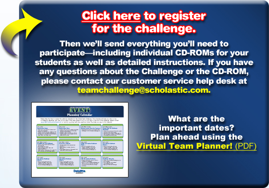 HURRY! Now is the time to register your students for the Deloitte Virtual Team Challenge 2008 Event! Not only will students learn what it means to work in a real-world setting, they will build life-changing skills! As part of this challenge, students across the U.S. will compete to plan a charity event for amazing prizes! Up to $10,000 to be awarded! (No Purchase Necessary)