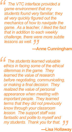 Virtual 3-D World Before? The program comes with an easy-to-use teacher tutorial that will let you try the world out before the program begins. See the simulation in action! All About the Virtual Team Challenge Help shape the “team player” in each of your students. Through the Virtual Team Challenge, students will build skills that are invaluable in the classroom and in the business world, including: