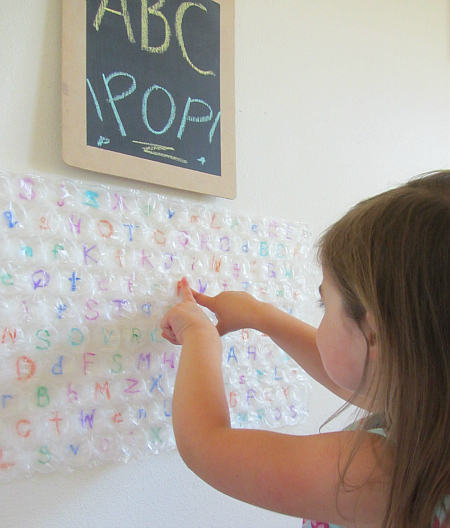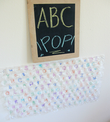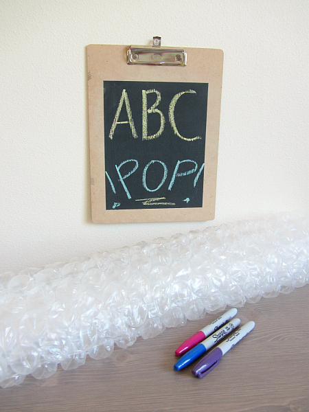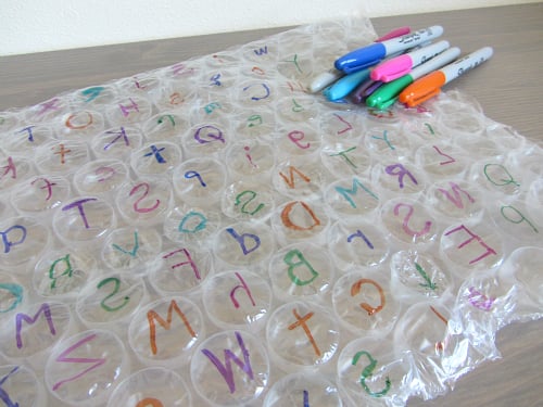 1. Flip the bubble wrap over and write letters on the plastic. Make sure you write them backwards. (Can you find where I flubbed up?)