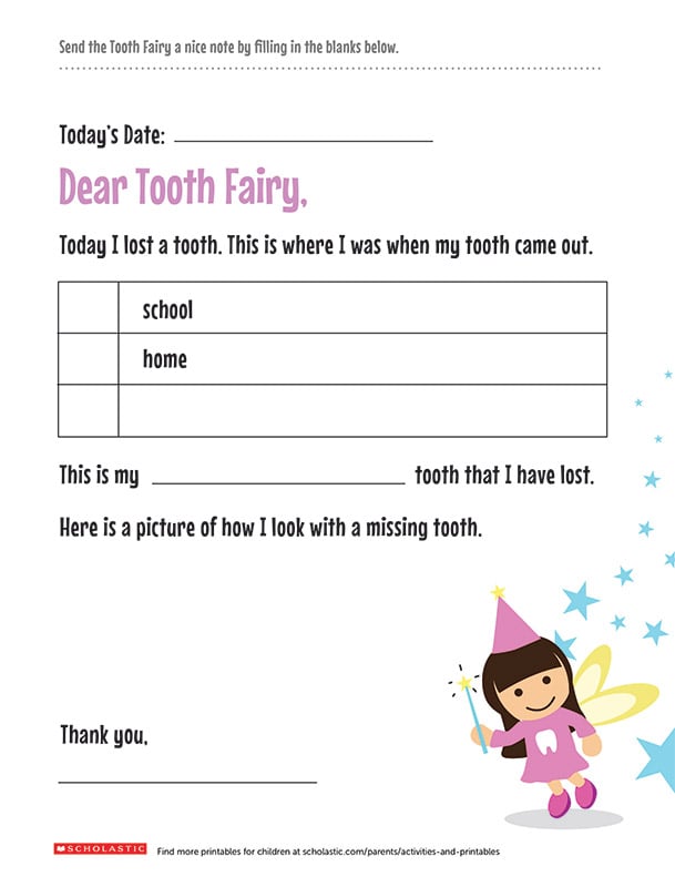 After you've enjoyed reading a story or two with your child, use these tooth fairy printables (for young and older children) as a special writing opportunity. Each time a tooth is lost, your child can write to the tooth fairy letting her know how the tooth was lost and when. The note can be left with the tooth for pick-up.