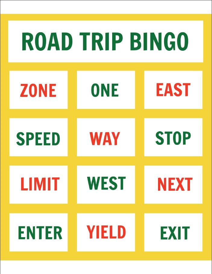- For shorter rides, or with younger children, this can be a plain old black out bingo game. Using a pencil or crayon, your child simply crosses out the word when they see it on road signs. The first person to cross out all the words wins. Easy right? But don’t worry you can make it harder! ...