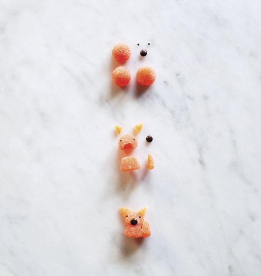 3. To make the ears and tail, take the second orange gumdrop and cut two triangular pieces for ears and one piece off the side for the tail. Use the toothpick to scrape away some of the sugar from the gumdrop to expose the stickiness where the ears will be placed. Press on the ears.