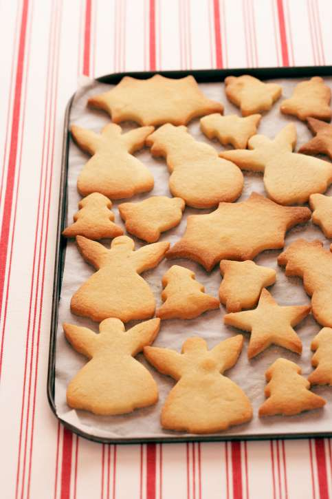 - Roll out the dough to about 1/8-inch thick. Cut out cookies with a table knife or holiday cookie cutters. Reroll the scraps and cut out more cookies.