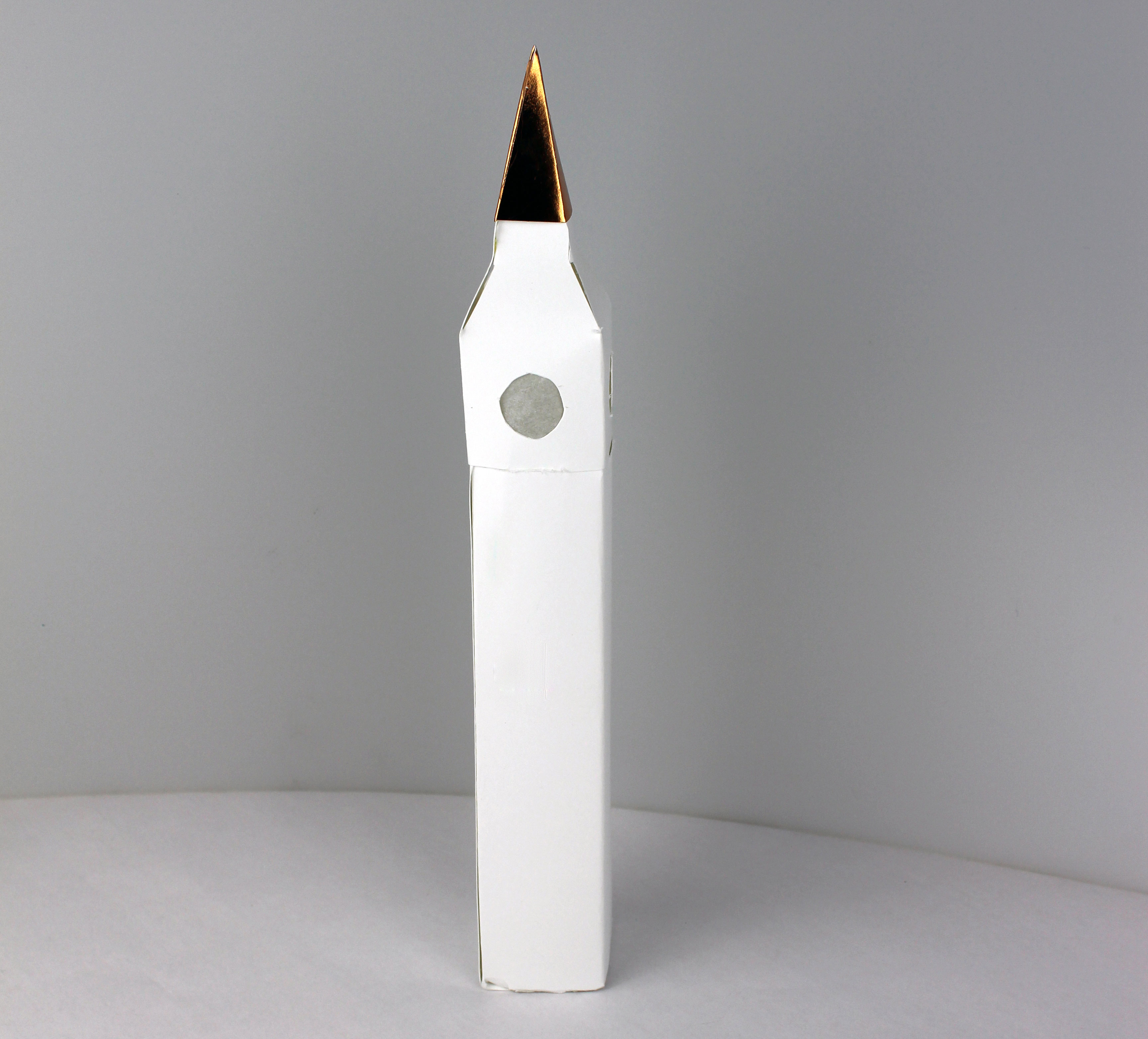 7. Assemble Big Ben: On page one of your Big Ben PDF, cut along the black lines using your X-Acto knife and fold on the dotted lines to create a tall, rectangular tower for Big Ben’s base. Fold the top flaps closed and tape in place to close the tower. On page two of the PDF, cut along the black lines and fold on the dotted lines to create the top of Big Ben. Place a battery-operated tea light on the flat top of the tower base, and attach Big Ben’s top by sliding the tabs into the slits. Add details with markers if desired.