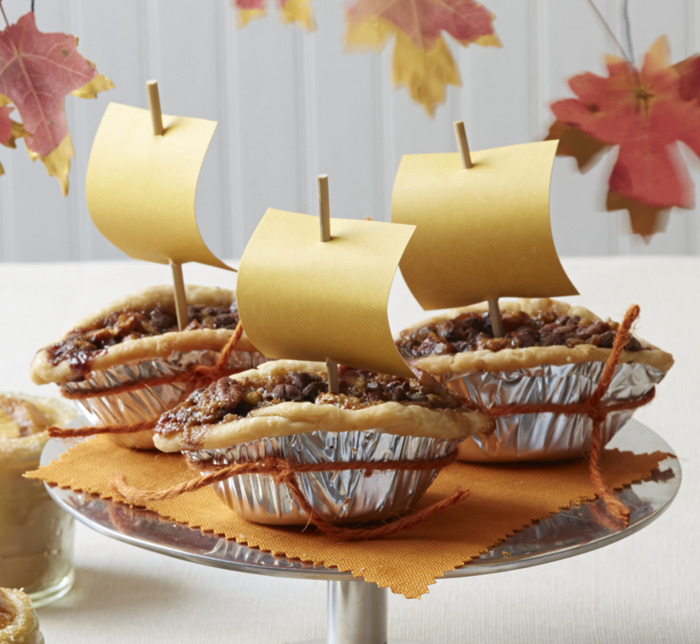 - Make the sails: Cut 2 ½" squares from construction paper. Poke a skewer through the paper and insert into the baked pies. Tie orange twine or string around the tins.