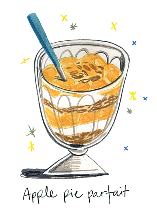 Cook 2 diced apples in a skillet with ½ tsp cinnamon and the juice of ½ lemon until softened; set aside. Mix ¼ cup each wheat germ and graham cracker crumbs in a small bowl. To create the parfaits, divide and layer the apples, the wheat-germ mixture, and a 6-oz vanilla Greek yogurt between 4 small glasses.