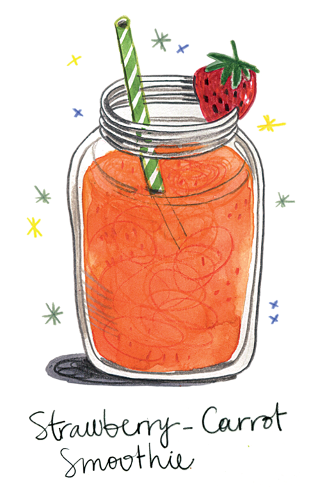 Combine 1 banana, 1 large chopped carrot, 10 to 12 whole frozen strawberries, and a splash of milk in a blender, and puree until smooth. Serve in a tall glass.
