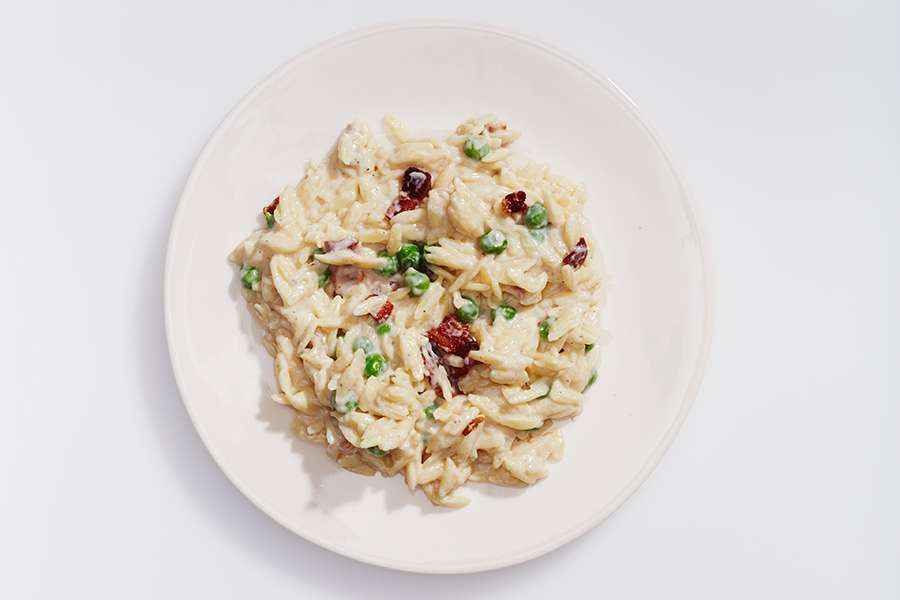 Cheesy Orzo with Bacon & Peas