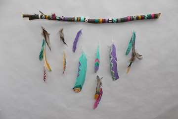 2. Wrap fishing line around the stem of each feather several times before knotting it. Next, tie each feather onto the stick. Stagger the length of each one to get your desired look.