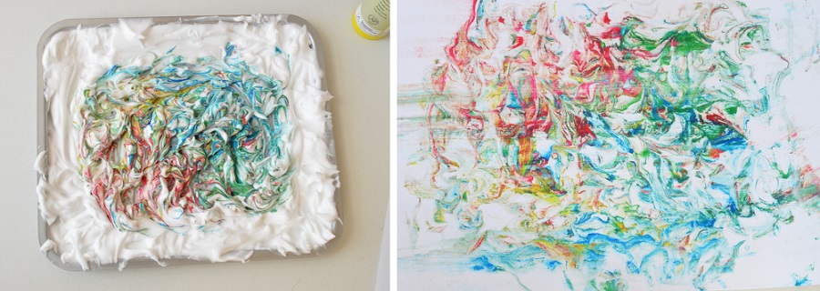 Swirl something wonderful! With a few dollops of paint and some masterful mixing, shaving cream transforms into a colorful concoction. Kids can just press a piece of paper onto it, lay the paper flat, then scrape off the shaving cream with a ruler or craft stick. The mess will come off and reveal a marbled work of art!