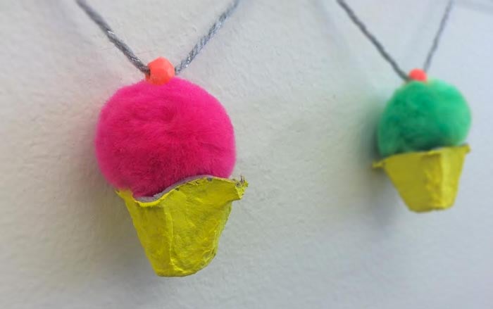 Transform pom-poms into cool ice cream cones kids can hang around the house! Cut the dividers out of egg cartons, paint them, and hot glue them to pom-pom scoops. Then, glue a cherry-red bead on top and string them together.