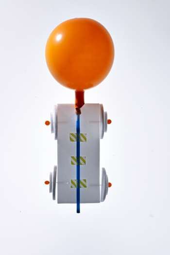 As the air leaves the balloon in one direction, it propels the car forward in the opposite direction. This illustrates Newton’s Third Law of Motion: Every action (in this case the air escaping out through the straw) has an equal and opposite reaction (the car moves across the room in the other direction)