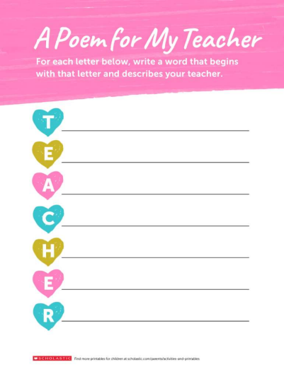 In an acrostic poem, each letter in a word is the start to a line in the poem. Give this printable to your child so they can write a heartfelt acrostic poem to share with their teacher. (As a bonus, this helps kids practice important letter recognition, writing, and vocabulary skills.)