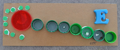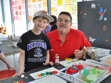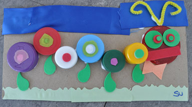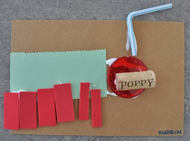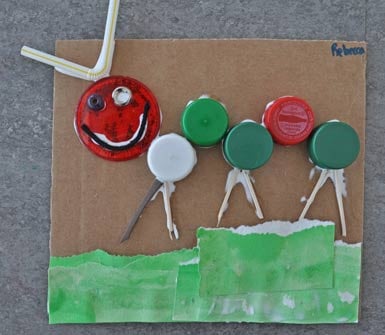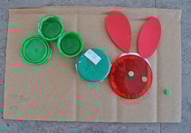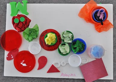 We love the variety of ways our guests use the mix of bottle caps, ribbons, paper, foam, corks, buttons, and other odds and ends we provide. Our favorite glue to use for found materials constructions is a thick white craft glue, but hot glue (with adult supervision) works too!