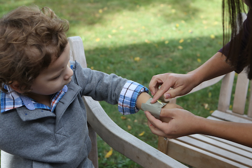 Step 2: Take a walk outside together, and search for small leaves, acorns, flowers, and other natural artifacts to adorn their bracelets.