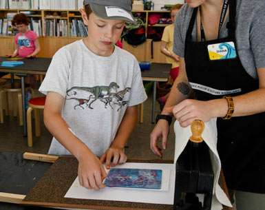 After mark-making they carried their inky plate over to the printing press station where I helped them run their plate and a piece of paper through our tabletop press. I made sure the pressure was set and handled the press blankets so they didn't get covered in finger prints and they were in charge cranking the handle. If you don't have a press you can just as easily hand press with pressure from rubbing your hands on the back of the paper into the inky plate.