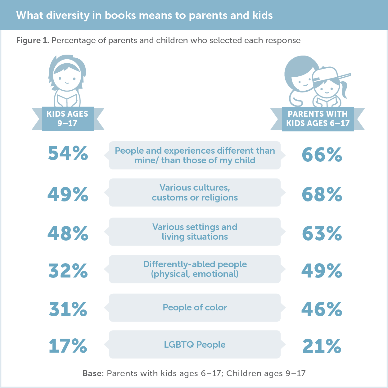 Diversity in children’s books has a broad meaning among kids and parents. A majority of parents and a near majority of kids ages 9–17 say diversity in children’s books includes people and experiences different than their own, various cultures, customs, religions, settings and living situations. And while not as commonly cited, many believe diversity in children’s books also includes differently-abled people, people of color and LGBTQ people (see Figure 1).