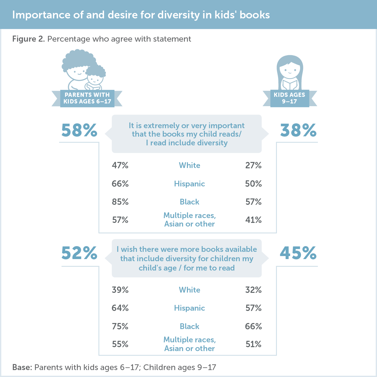 About half of kids ages 9–17 and parents overall agree “I wish there were more books available that include diversity.” This sentiment increases to 76% of kids and 69% of parents who also agree diversity in children’s books is important. The desire for more diverse books is strongest among Black children and their parents, followed by Hispanic families, then by families of multi-racial, Asian or other racial backgrounds (see Figure 2).