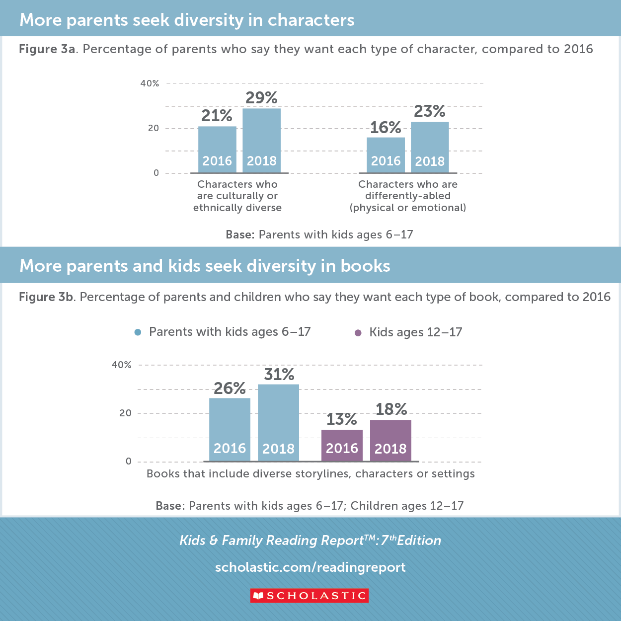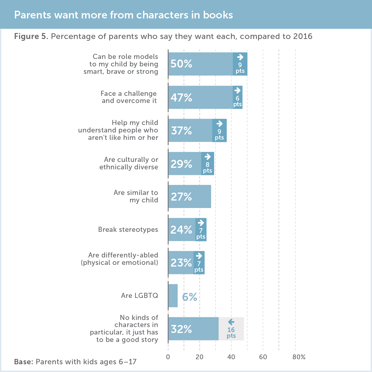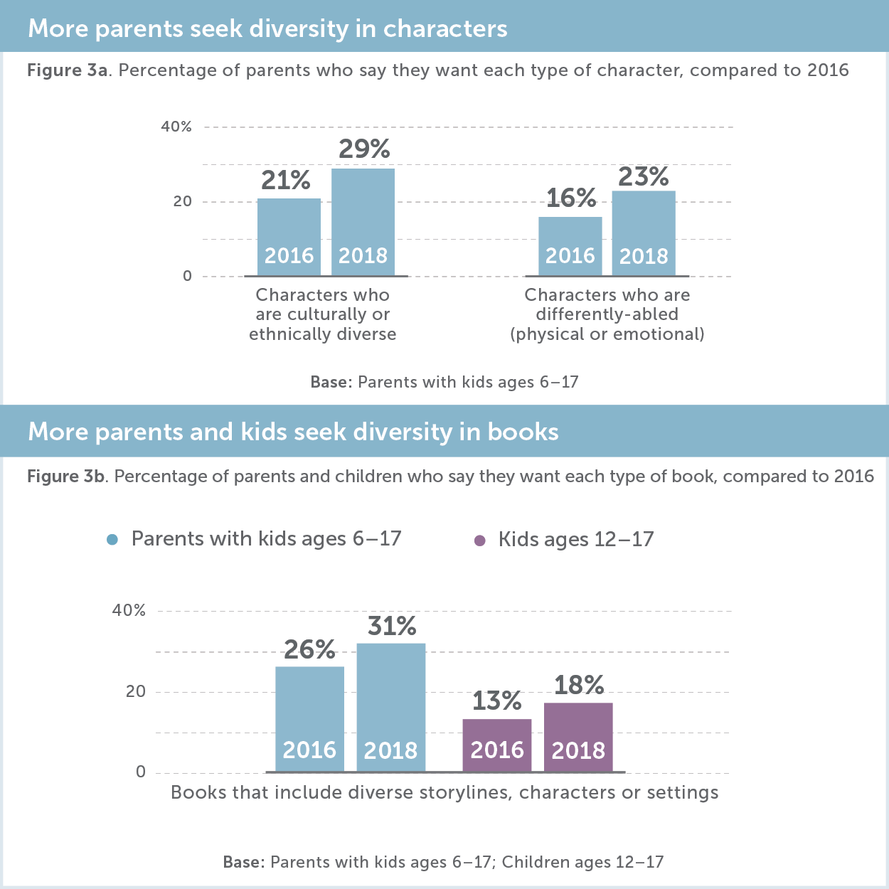 Both kids ages 12–17 and parents of children across ages are more likely today than they were in 2016 to want books with diverse storylines, characters or settings (18% of kids, up six points; 31% of parents with kids ages 6–17, up five points; parents of children ages 0–5 up nine points to 36%). Since 2016, parents are also more likely to want culturally or ethnically diverse characters (21% to 29%, up eight points) and differently-abled characters (16% to 23%, up seven points) (see Figure 3a/b).