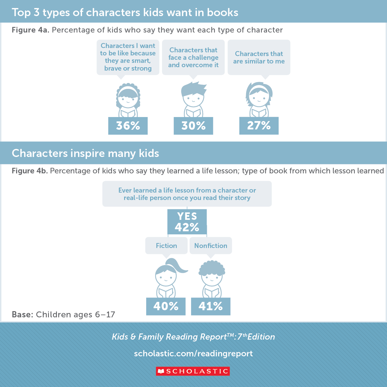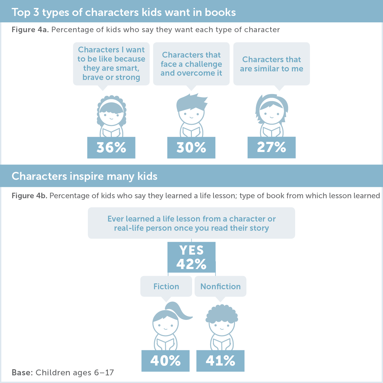 While a good story is, of course, a key factor that influences a parent or child’s desire for a book, a book’s characters are an important driver of preference and integral to the overall social-emotional benefits of reading. The top three types of characters kids ages 6–17 want in books do not vary across gender, age or ethnicity and reflect the reader’s own aspirations: characters who they want to be like because they are smart, brave or strong, who face and overcome challenges, and who are “similar to me” (see Figure 4a). A 13-year-old girl simply stated, "I like to read books [about] girls my age who can achieve things beyond reach, who overcome difficulties and become great.”