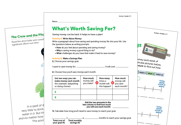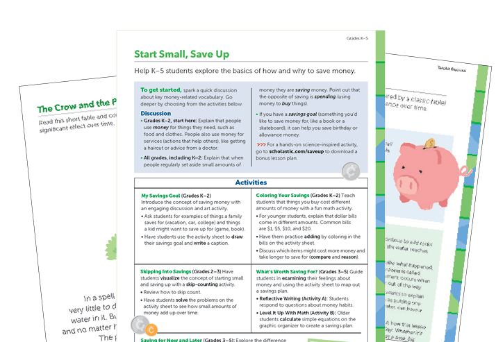 Use these cross-curricular materials—spanning skills like counting, calculating, reading, writing, and reasoning—to help students investigate the value of money, saving, and goal setting.