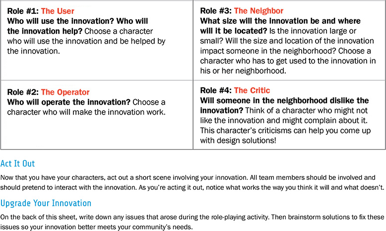Do the Challenge: Think of some characters for your role-play. These will be specific people who will interact with your innovation. Read the roles described in the chart below and then identify some characters who can play these roles.