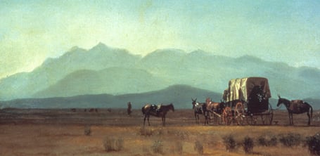 In the 1840s and 1850s the western frontier began at the Mississippi River. Hundreds of thousands of pioneers made the long trek west to new frontiers in Oregon and California. For months they lived in covered wagons stuffed with all their possessions. These adventurers traveled in caravans, with 30 or more wagons rocking westward on the overland trails. On fine days a wagon train could cover 20 miles (32 kilometers); when the rains brought mud, the pioneers would be satisfied to cover half that distance. To learn more about the journey west, read Joshua's Oregon Trail diary.