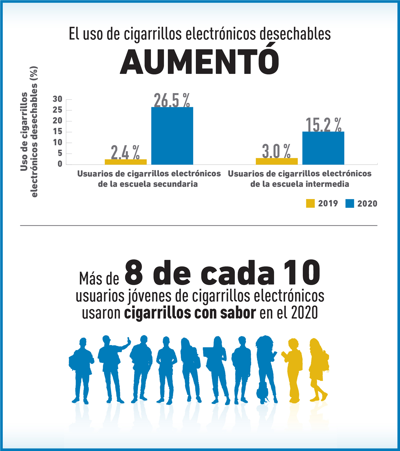 Los jóvenes consideran que el uso de cigarrillos electrónicos es común entre sus compañeros. En el 2020, alrededor del 60 % de los jóvenes indicaron que vieron a alguien usar un cigarrillo electrónico en la escuela o en sus alrededores. Los adolescentes también compartieron dónde vieron que esto sucedía: