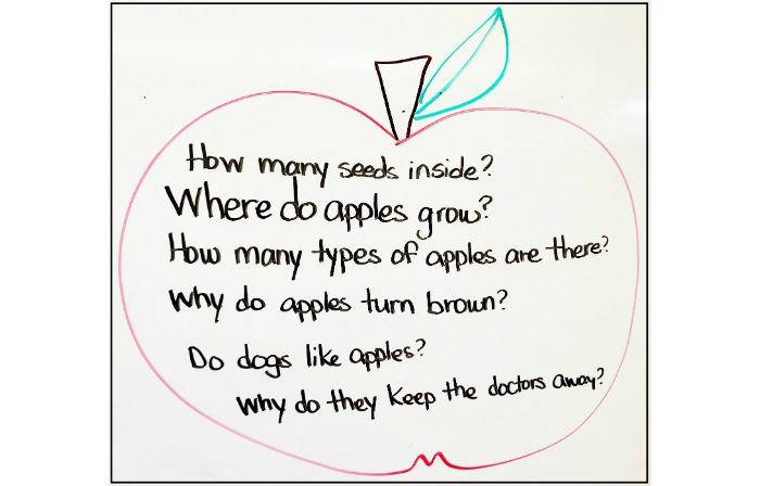 To begin our lesson, I drew a giant apple on the board and asked the students to think of questions they had about apples. It's always interesting to open up a classroom of first graders to questions!