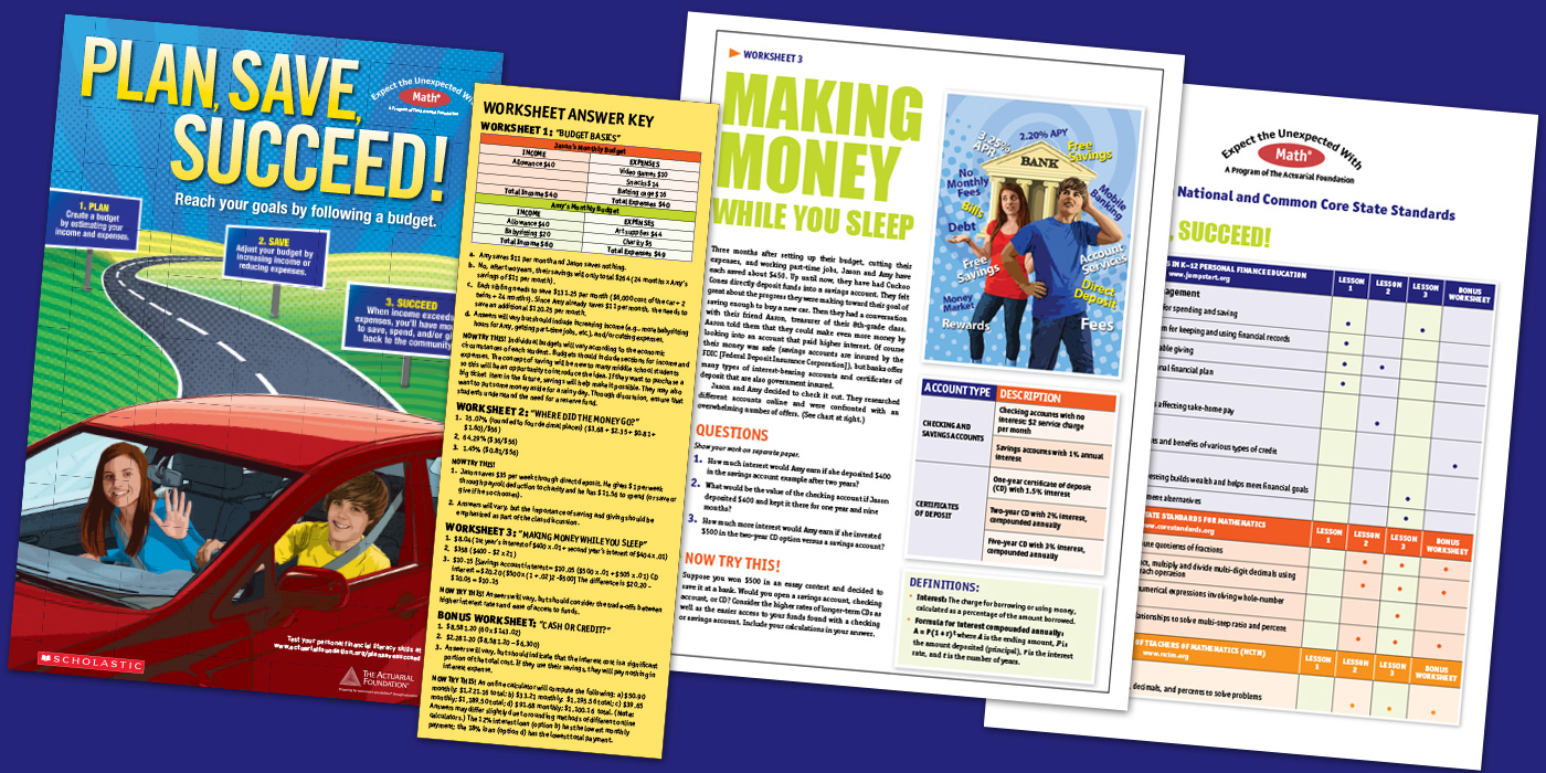 Developed by The Actuarial Foundation with Scholastic, the program provides knowledge and skill-building activities through a fun, relatable story line about two siblings saving to buy a car. They construct a budget and learn about earnings and deductions from work, interest from saving, and the cost of credit.